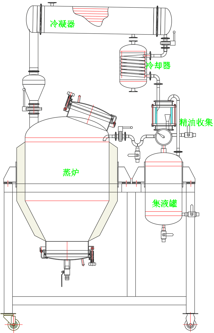 工艺流程:开启加水,可隔水蒸馏,也可共水蒸馏,开电加热或蒸汽,水沸腾产生蒸汽,蒸汽透过提取机内物料,随及将精油纯露析出,精油纯露蒸汽沿排汽管上