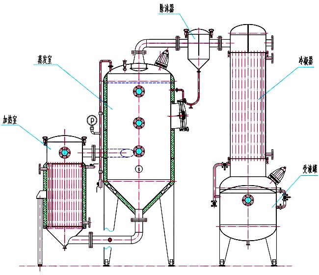 单效外循环真空浓缩器,由加热器、蒸发器、除沫器、冷凝器、冷却器、受液罐等组成,凡与物料接触部件均采用优质不锈钢制作,本设备